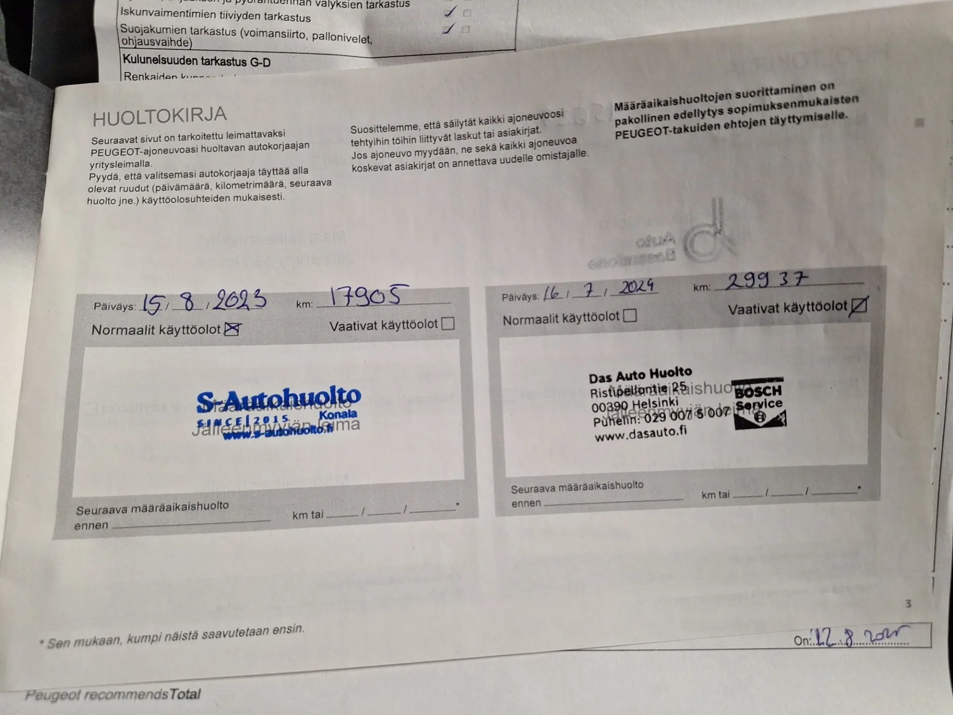100 punkti test, pikk proovisõit, diagnostika, ajaloo kontroll, kontroll tehnoülevaatuspunktis
