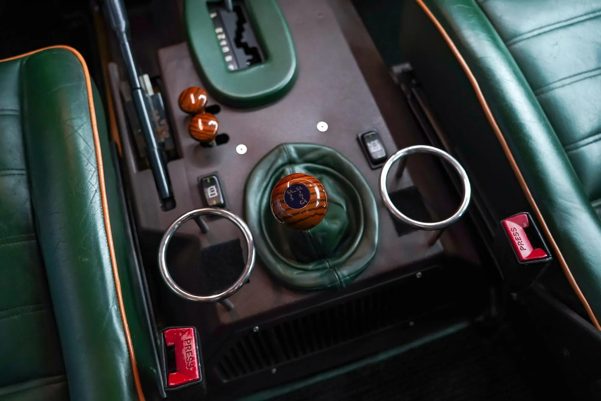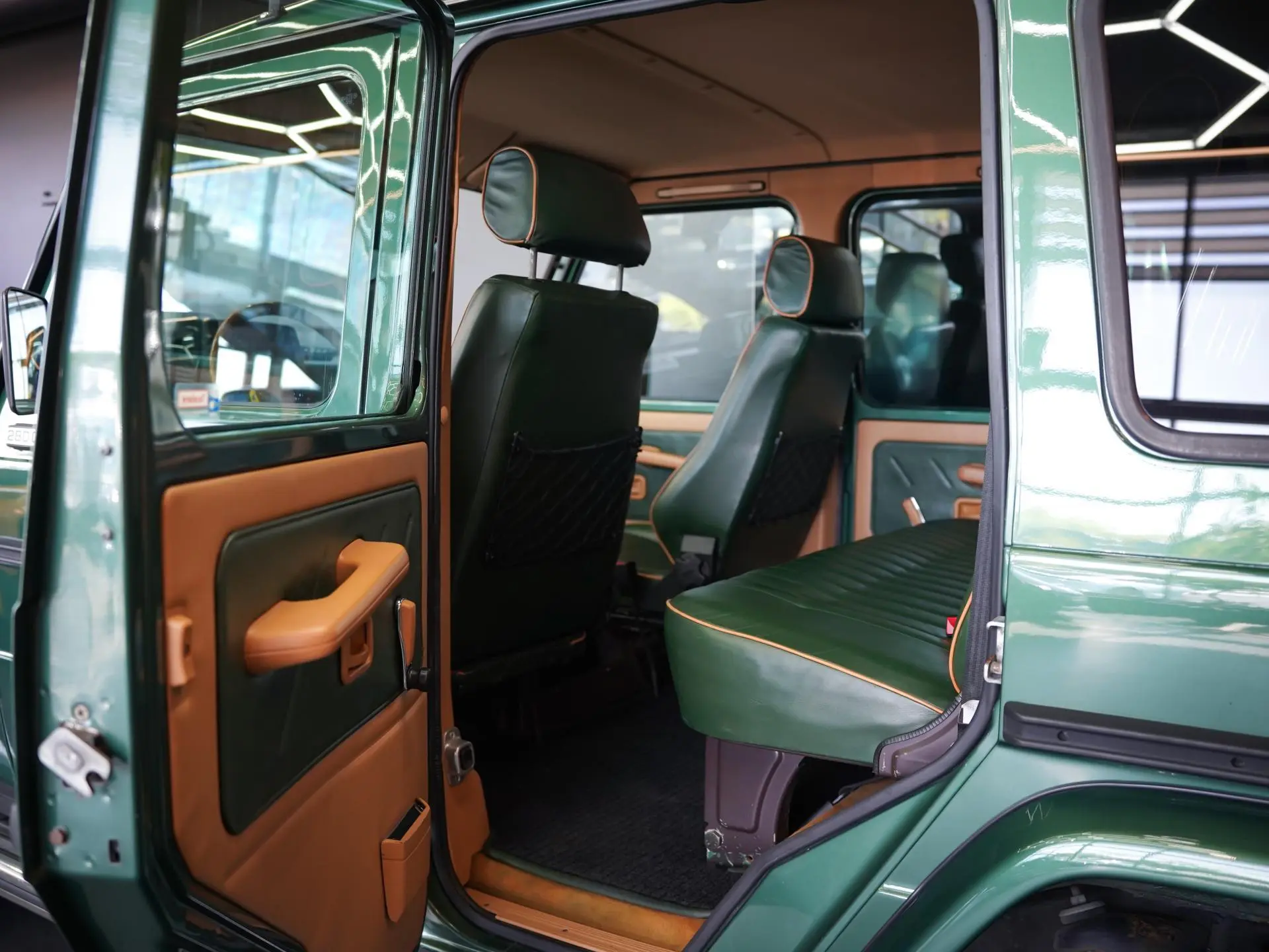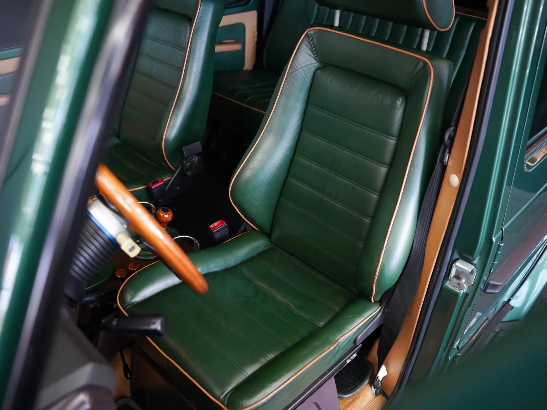 Stiilne salong on viimistletud rohelise ja beeži nahaga, kontrastsete õmblustega, ees on Recaro istmed ning pagasiruumi põrandal on puiduimitatsiooniga parketilaadne kate. Salongi restaureerimine sai tehtud Eestis, 2024 suvel.