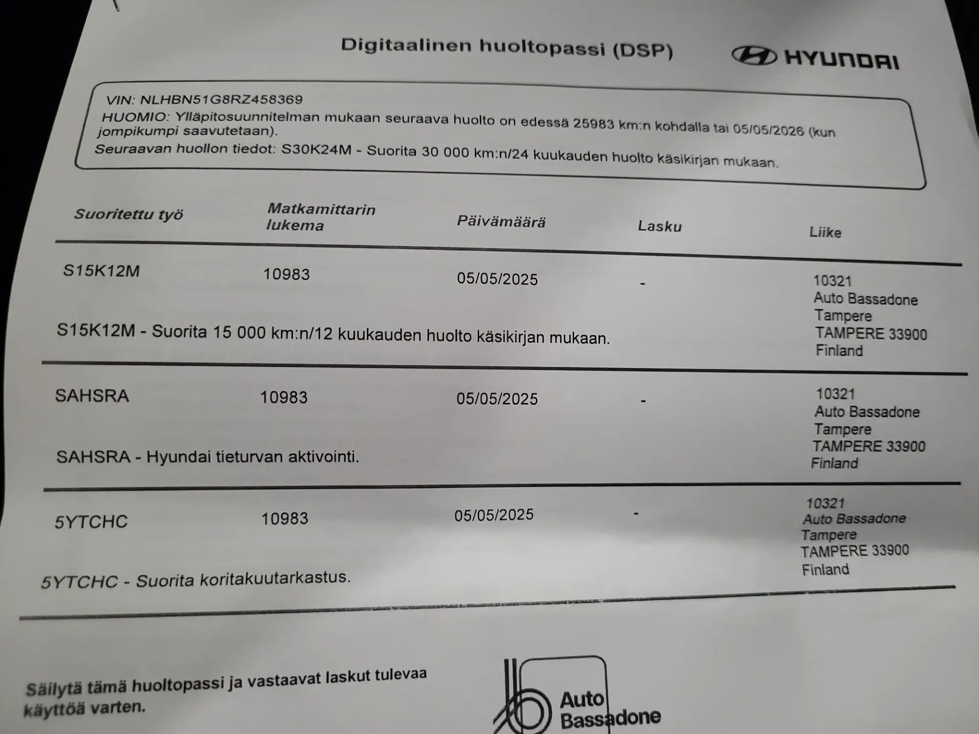 - Viimeisin huolto: 5.5.2025 / 10983km