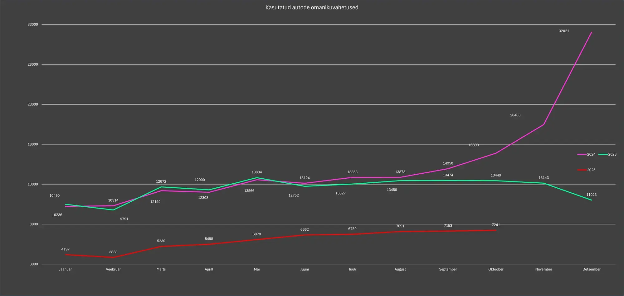 Tulles tagasi eelmise aasta oktoobri juurde siis on kasutatud autode turg langenud 57 protsenti. Kui vaadata aastat 2023 siis on langus 46 protsenti. Eelmise aastaga võrreldes peame me aga arvestama, et nendes numbrites on sees turu kasv, mis eelnes automaksu kehtima hakkamisele. 2023 aasta numbrites automaksu mõju puudub. Siit on selgesti näha automaksu mõju tänasele turulangusele.
